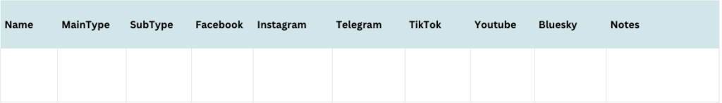 Finding and verifying seed data was done by performing an online search for the entity. The entity’s social media handles could often be found on their personal or professional websites. In addition, the research assistants verified seed data by checking the entity’s social media pages for links or Linktrees to their other social media accounts (X, Instagram, Facebook, Youtube, TikTok, Telegram, Bluesky).